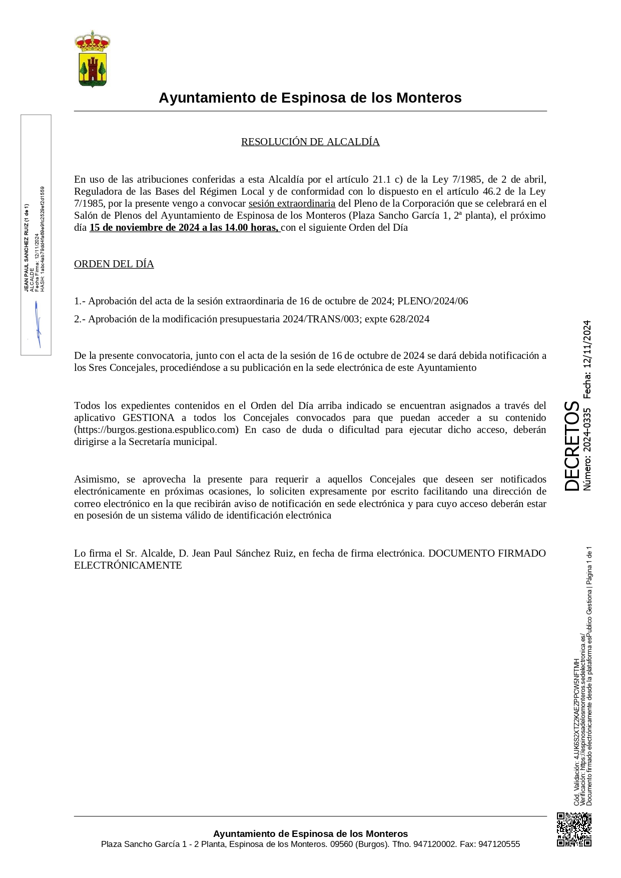 Sesión extraordinaria del Pleno de la Corporación que se celebrará en el Salón de Plenos del Ayuntamiento de Espinosa de los Monteros (Plaza Sancho García 1, 2ª planta), el próximo